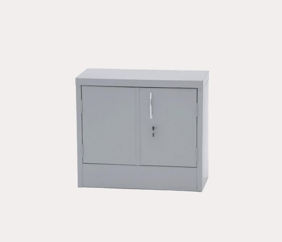 Armário de aço PA 50 com duas portas e uma bandeja fixa. Chave e puxador inclusos.