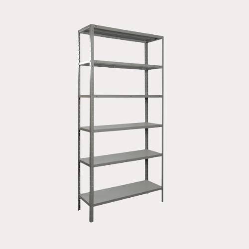 Estante na cor cinza, com 06 bandejas reguláveis e reforço ômega, com capacidade para suportar uma sobrecarga de até 30 quilos por bandeja.